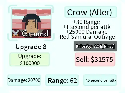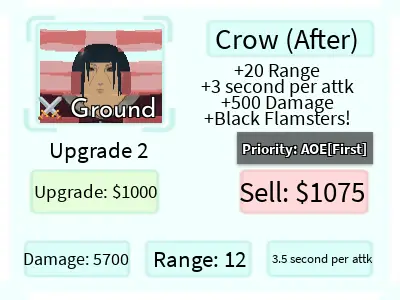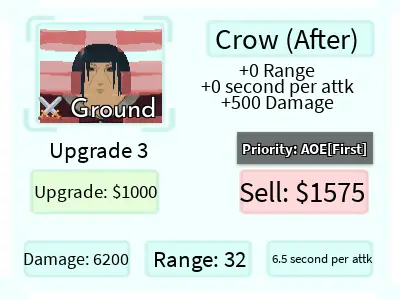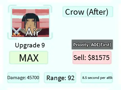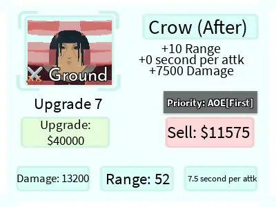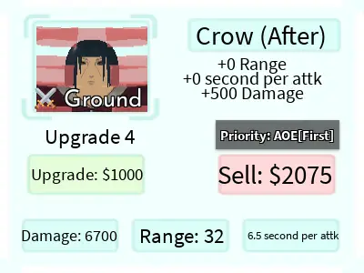 Crow(After) é um personagem terrestre 6 estrelas de All Star Tower Defense baseado em Itachi Uchiha de Naruto Shippuden. Em seu último upgrade Crow(After) dispara Amaterasu nos inimigos, inclusive aéreos.