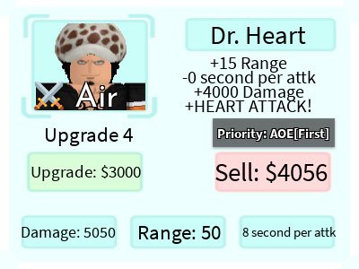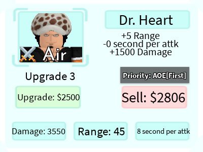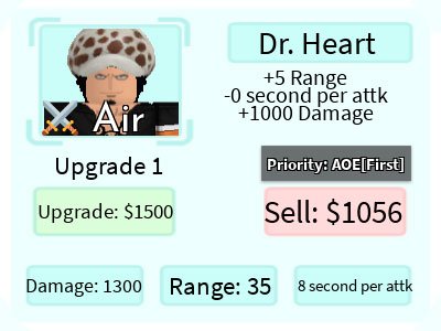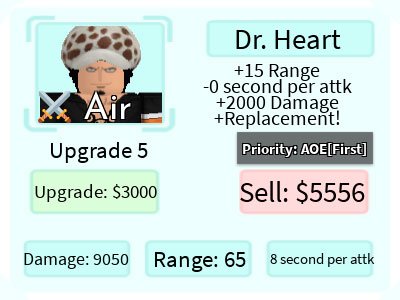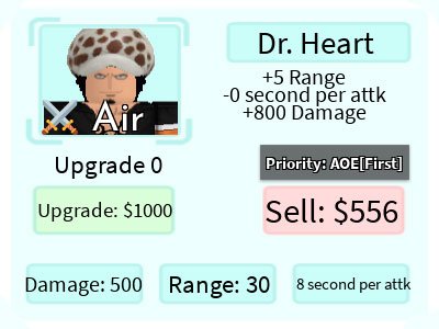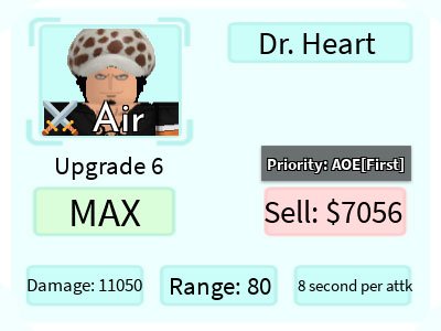 Dr. Heart é um personagem aéreo 5 estrelas de All Star Tower Defense baseado em Trafalgar D. Water Law de One Piece.