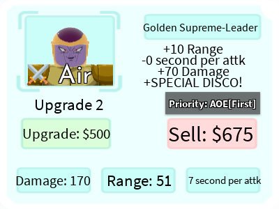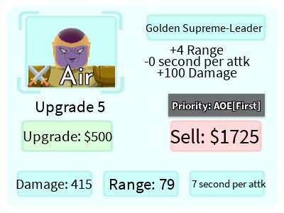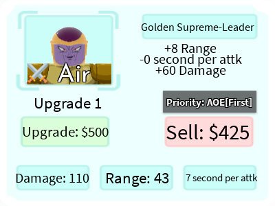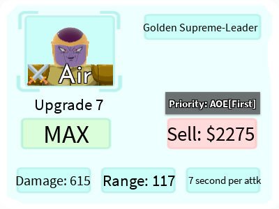 Golden Supreme-Leader é um personagem aéreo 6 estrelas e cone aoe baseado no Golden Freeza de Dragon Ball. Ele possui uma grande área de ataque e causa alto dano, mas com um tempo para ataque muito longo. Ele é mais viável para o modo de história devido ao quão barato ele é. No geral, ele é muito útil para missões de Trials, Raids e Story Mode.