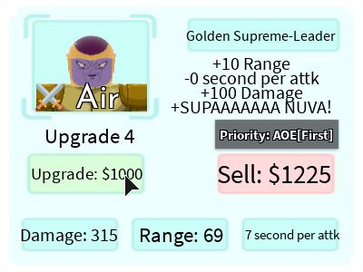 Após o update de maio de 2021 de All Star Tower Defense o Golden Supreme-Leader ganhou um aumento considerável na sua área de ataque cobrindo quase a metade de alguns mapas do Story Mode.