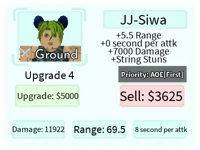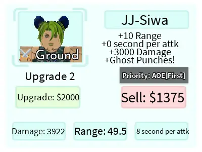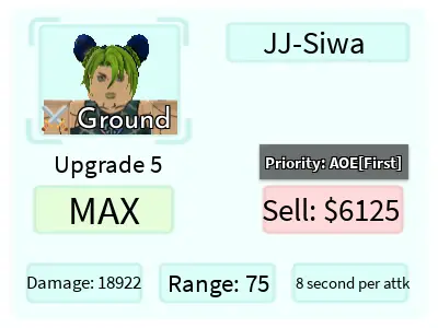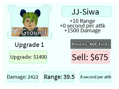JJ-Siwa é uma personagem terrestre 5 estrelas de All star Tower Defense baseada em Jolyne Kujo de JoJo’s Bizarre Adventure, filha de Jotaro Kujo.