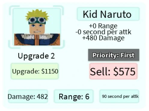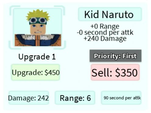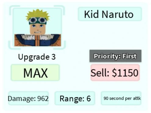 Kid Zaruto é um personagem terrestre 3 estrelas do tipo invocador de clones baseado em Naruto do anime Naruto. Ele invoca um clone de si mesmo a cada 90 segundos em um efeito Steam Roller que causa danos aos inimigos por onde passar. O Kid Zaruto invocado pode atravessar vários inimigos até que sua saúde seja igual a zero.