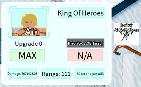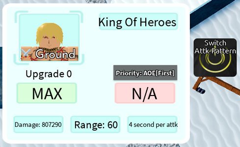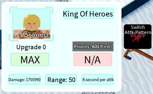 King Of Heroes é um personagem terrestre 6 estrelas de All Star Tower Defense baseado em Gilgamesh (Full Power) de Fate – Hollow Ataraxia e Fate – Grand Order.