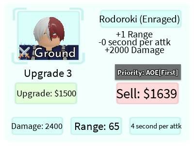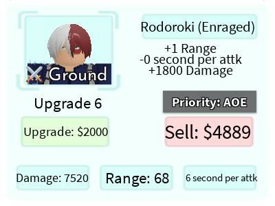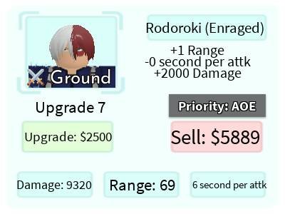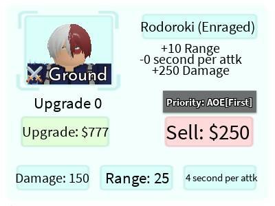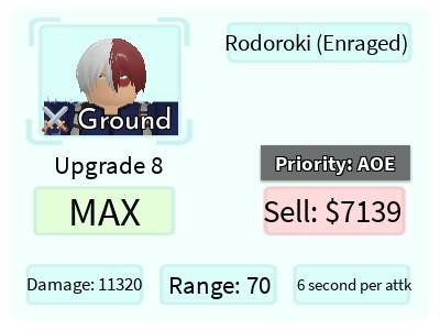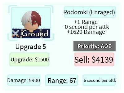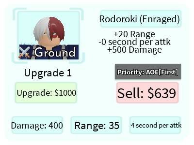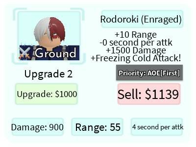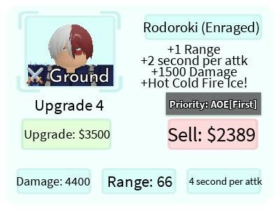Rodoroki Enraged é um personagem terrestre 5 estrelas de All Star Tower Defense baseado em Todoroki de My Hero Academia.