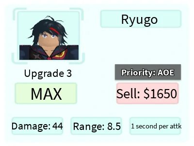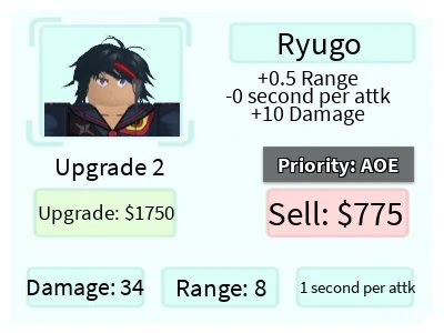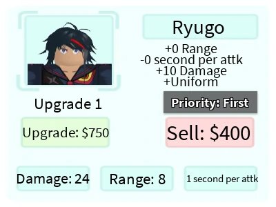 Ryugo é uma personagem terrestre 3 estrelas de All Star Tower Defense baseada em Ryuko de Kill la Kill.