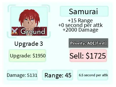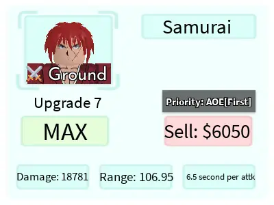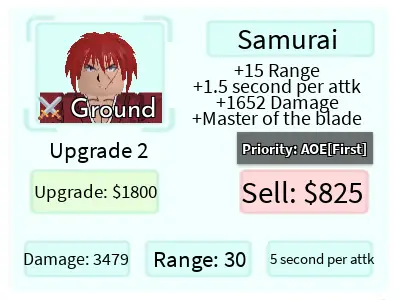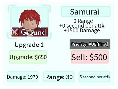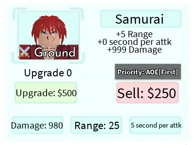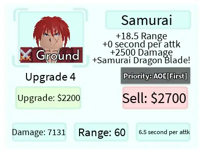 Samurai é um personagem terrestre 5 estrelas de All Star Tower Defense baseado em Himura Kenshin do mangá Rurouni Kenshin.