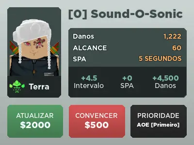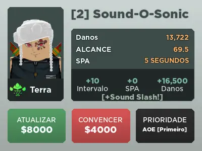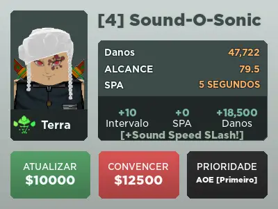 Sound-O-Sonic é um personagem terrestre 6 estrelas de All Star Tower Defense baseado em Sound Hashira de Demon Slayer.