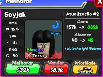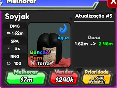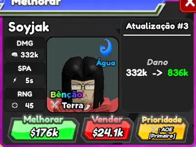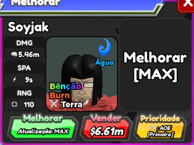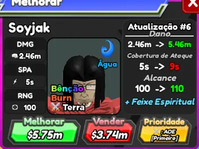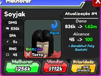 É um personagem caro, mas o dano de fogo é grande. Uma boa idéia para infinity mode é colocar um Flower Magus junto, que dá o buff de range, assim a área de ataque de Soyjak cobre o mapa inteiro.