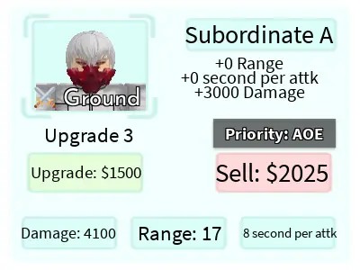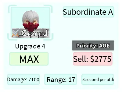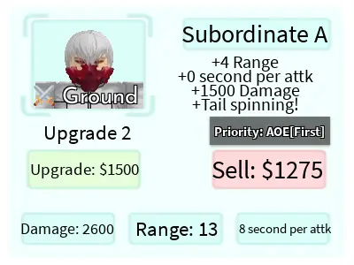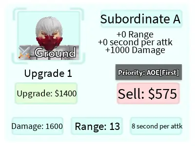 Subordinate A é um personagem terrestre 4 estrelas de All Star Tower Defense baseado em Tatara de Tokyo Ghoul.