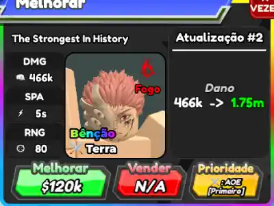 Assim sendo considere não usar a habilidade dele e como resultado você terá um baita personagem, até mesmo pela sua área de ataque que é uma das maiores do jogo. Na tabela de estatísticas abaixo você verá o enorme dano no level 1 e sem buff. Espero que não nerfem o The Strongest In History tão cedo.