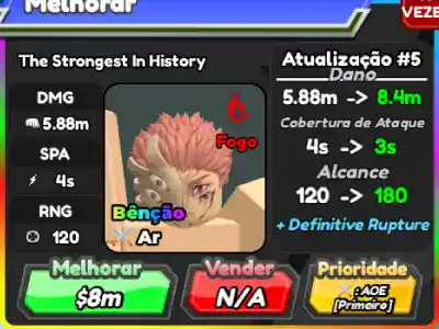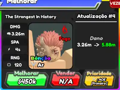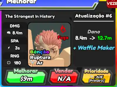 Sukuna 7 estrelas vem com multiplas habilidades no seu upgrade final, a primeira delas se chama Waffle Maker que elimina todos os inimigos com 10% ou menos de vida.