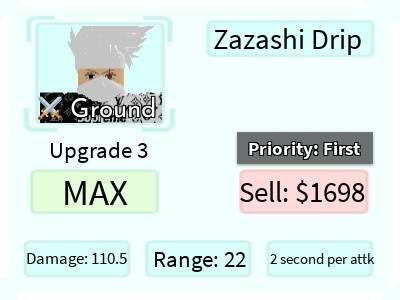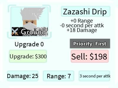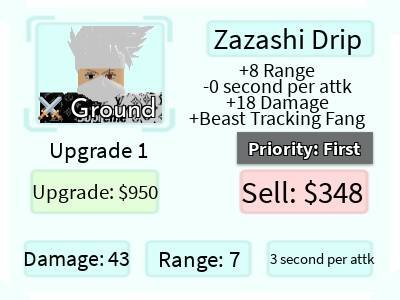 Zazashi Drip é um personagem 5 estrelas de All Star Tower Defense baseado em Kakashi do anime Naruto. Ele é uma versão de Zazashi Ultimate com uma skin diferente.